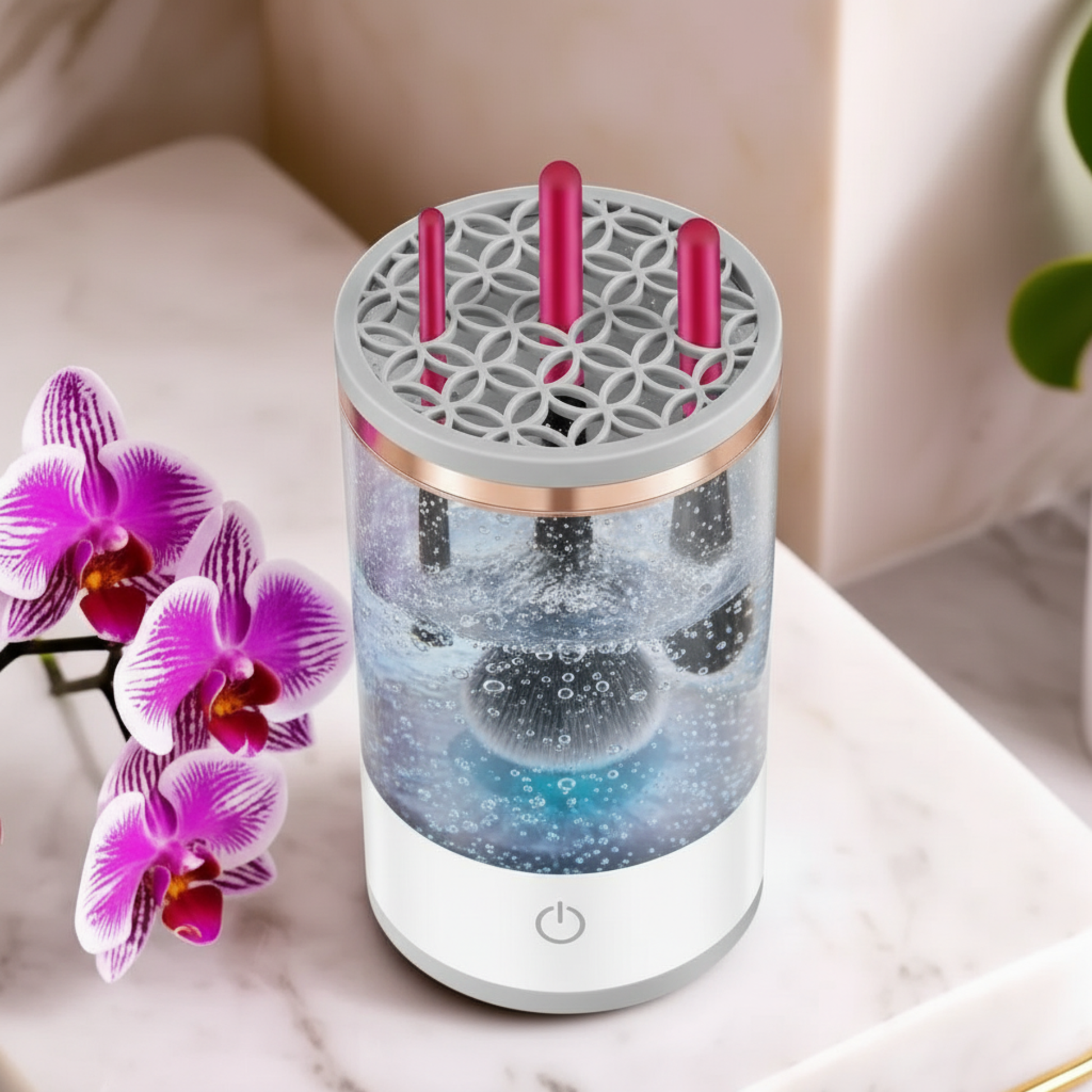 Кажи сбогом на мръсните четки и раздразнената кожа! С този уред ще почистиш четките си професионално само за секунди. Мощният воден вихър премахва грим, бактерии и натрупани замърсявания, без да уврежда косъмчетата.